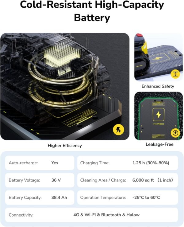 - With a 38.4Ah battery, Yarbo performs reliably in temperatures as low as -25°C, while its chute rotates from -10° to 190° and the deflector adjusts from -5° to 50°, throwing snow 6–40 ft with precise placement.