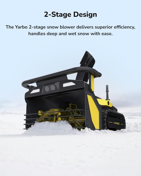 - Yarbo snow blower’s two-stage system breaks and expels snow efficiently, handling heavy, dry, wet, packed, and icy snow conditions.